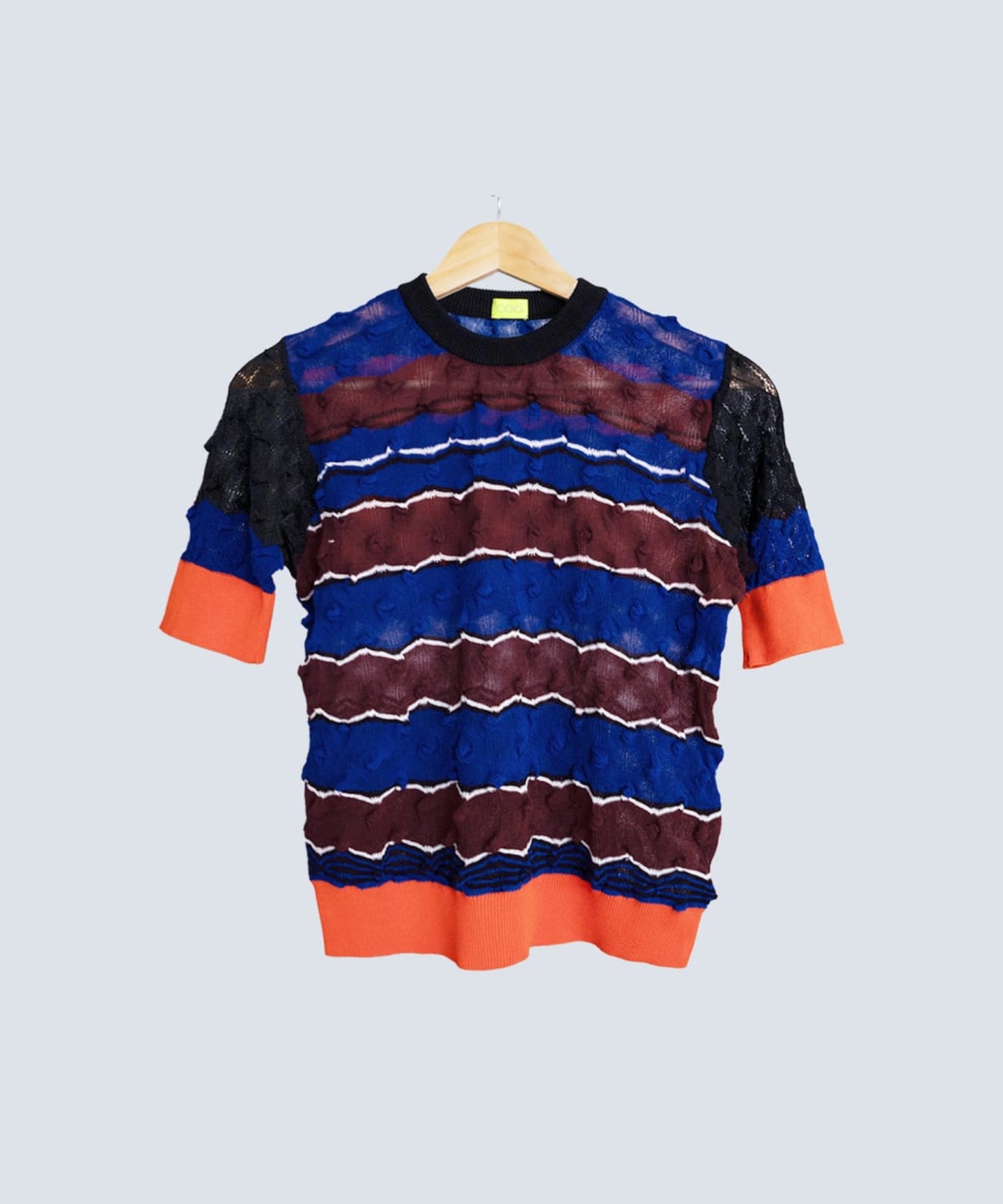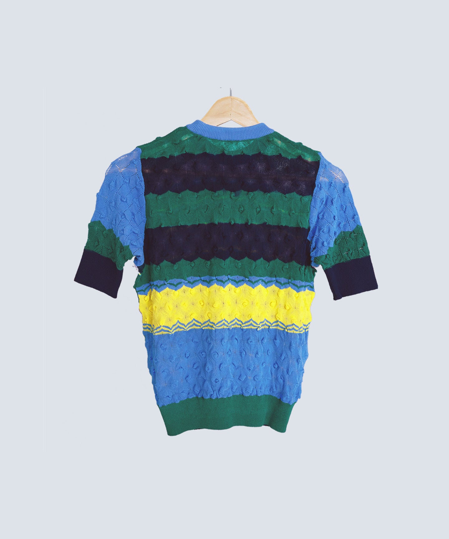 コットン強撚糸のシャリ感素材を使用した、凹凸ある組織がデザイン性の ある半袖ニットです。