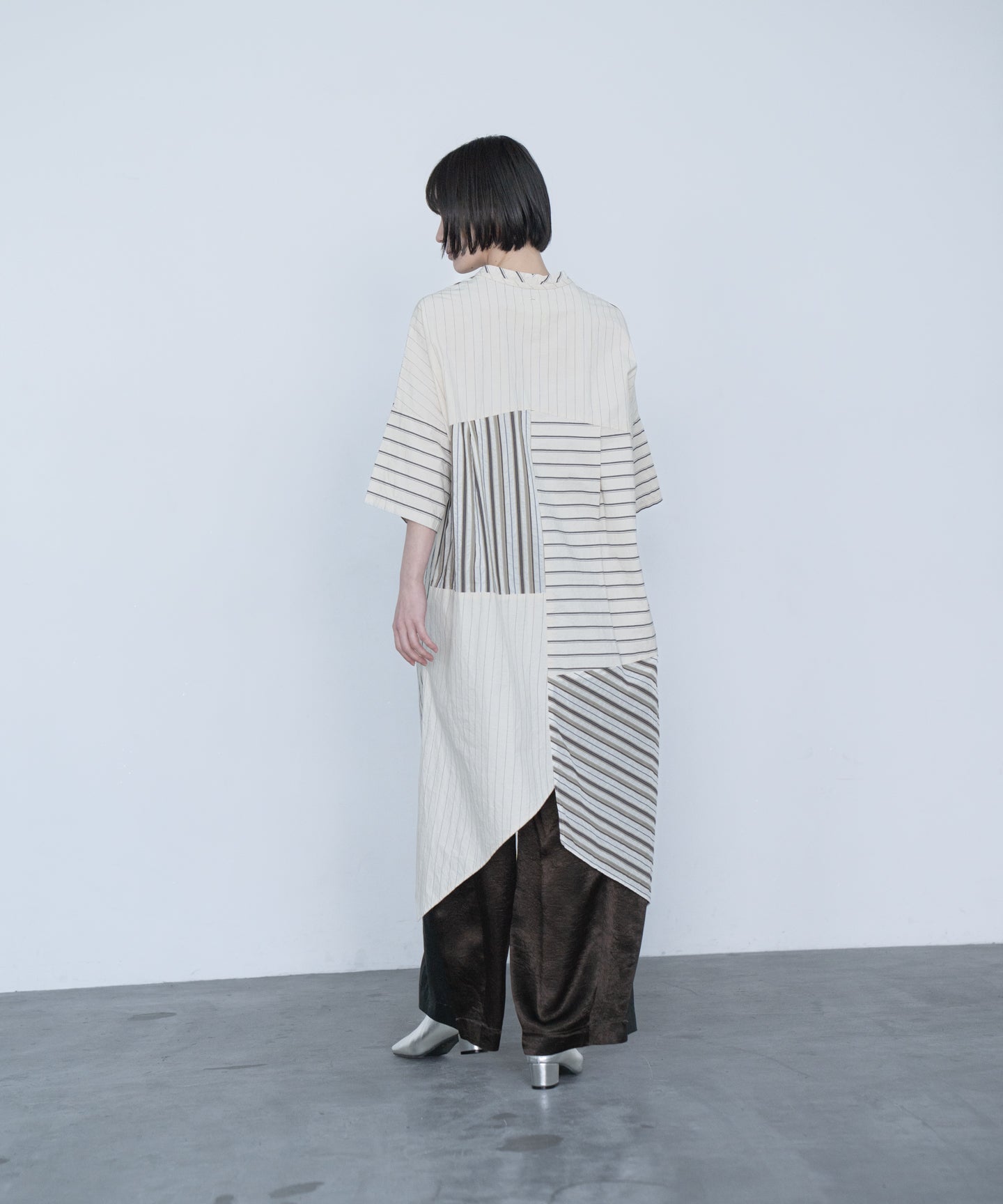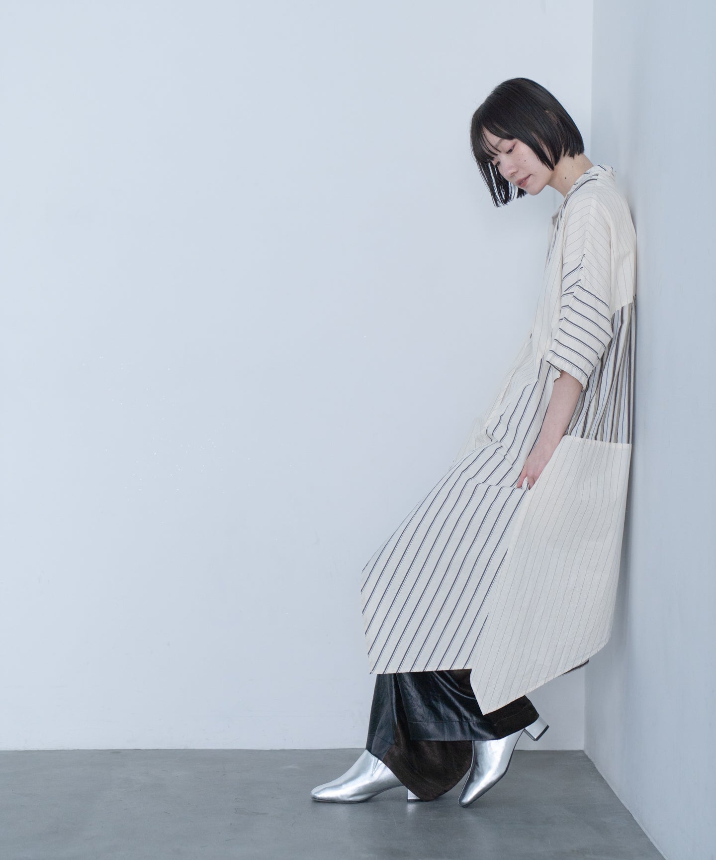 This original stripe is produced in Yamanashi and woven from a blend of cupra and cotton. The change in the weave causes the stripe ridges to stand out slightly, creating a unique look. The simple stripe is a typewriter pattern woven with cotton and linen threads at a high density, giving it a craft-like feel. The light green is made from 100% organic cotton and has been washed to create a textured look. Both stripes have a workwear-like feel. This dress has a craft-like feel, reminiscent of patchwork fields spreading across vast hills, and can be worn alone or with other outfits. It has a washed finish.