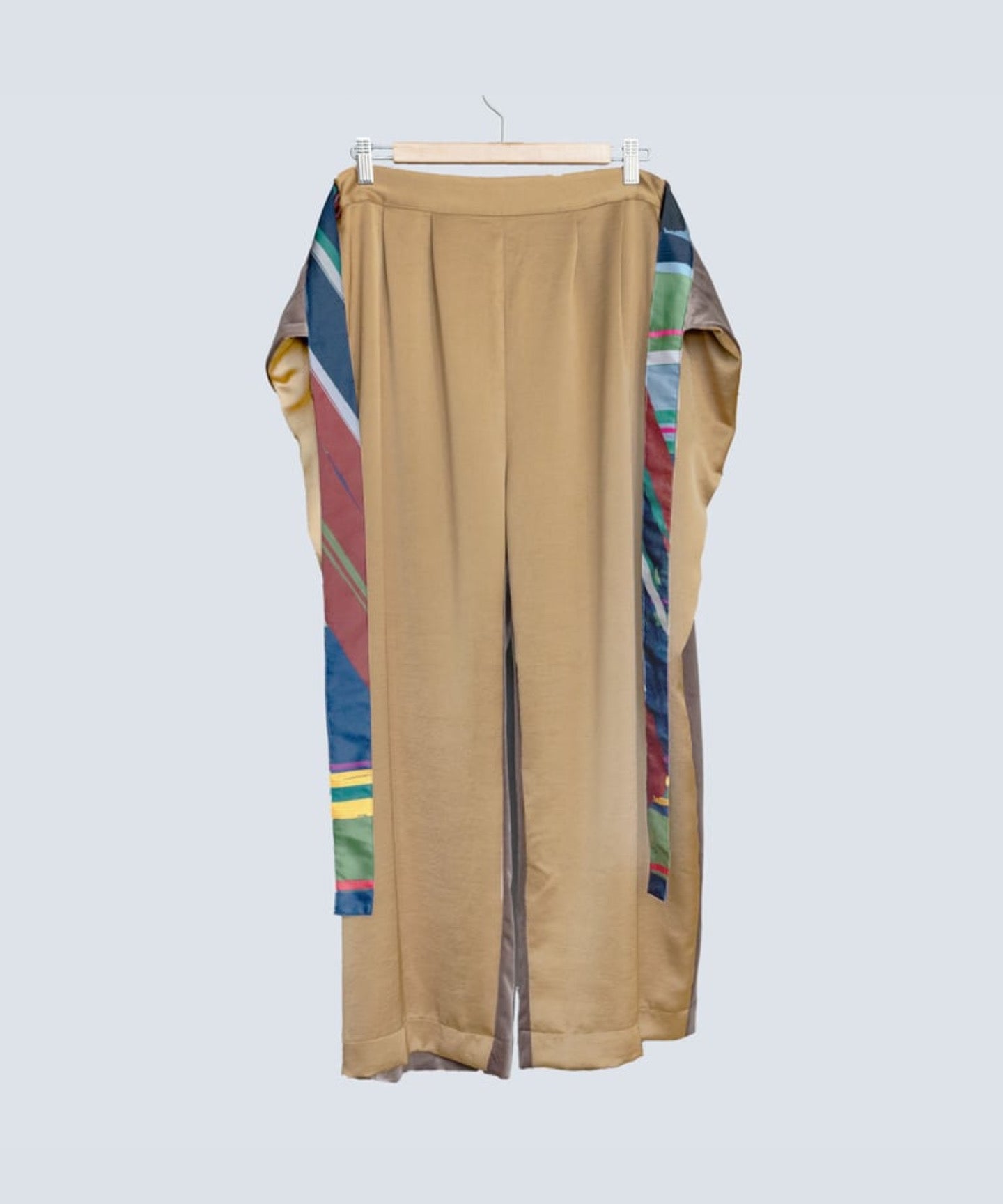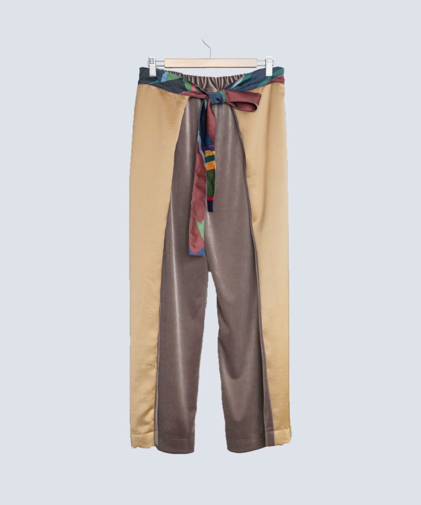 These pants can be worn both front and back, allowing you to enjoy two different designs. They combine a drapey satin material with a lightweight velour material that adds a seasonal touch. The elastic waistband ensures a comfortable fit. The belt, made from leftover fabric with an original design, adds an accent and can be worn freely, either hanging naturally or tied into a bow or a single bow.