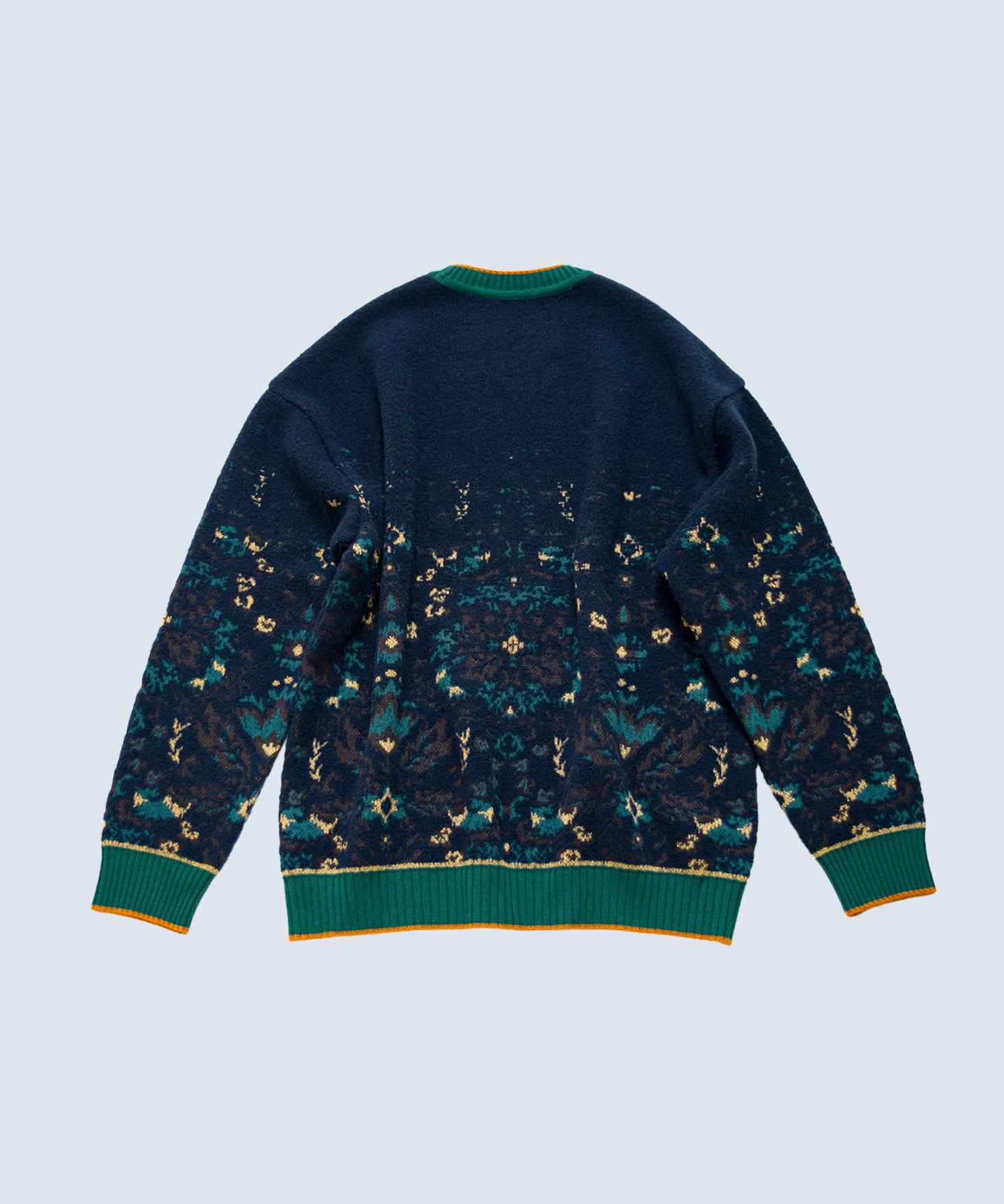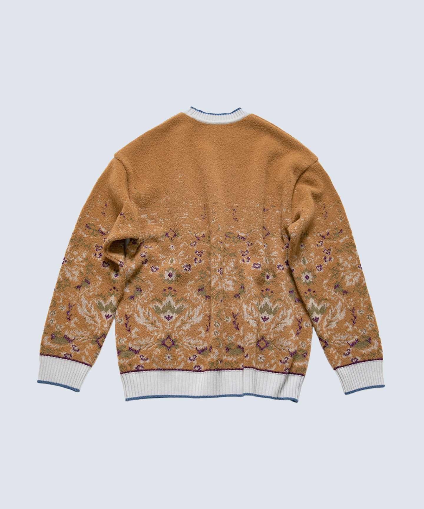 The motifs are Hokkaido flora and fauna. It's made from a composite of cupra, a regenerated cellulose fiber made from the down around cotton seeds, and shrink-resistant wool. It features the softness of cupra and excellent color development. It also has moisture-wicking, heat-generating, and anti-static properties. The boucle portion is made from extra-fine merino wool, which is untwisted, giving it a fluffy yet lightweight feel.