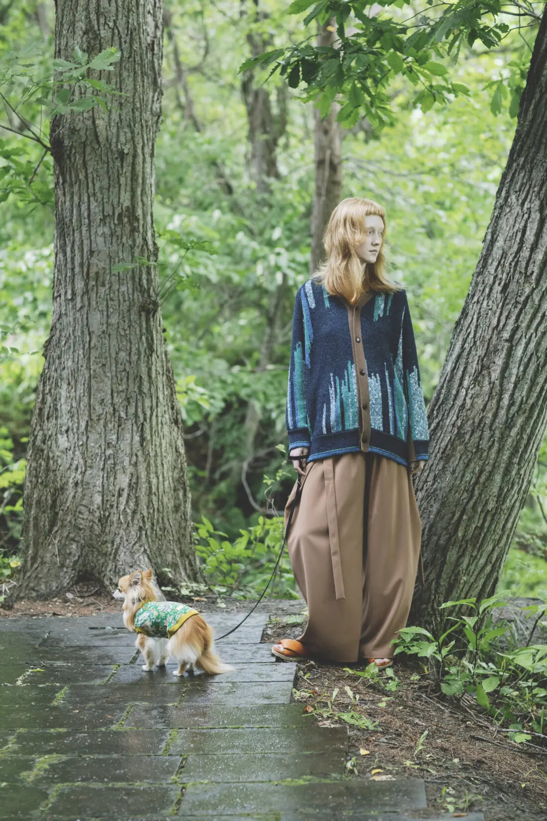 The material used is a combination of recycled wool nylon, silk nep, and washi paper yarn, made from scraps of clothing with a high wool content, and cotton waste.The combination of mixed fancy yarns creates a sense of blending into nature.