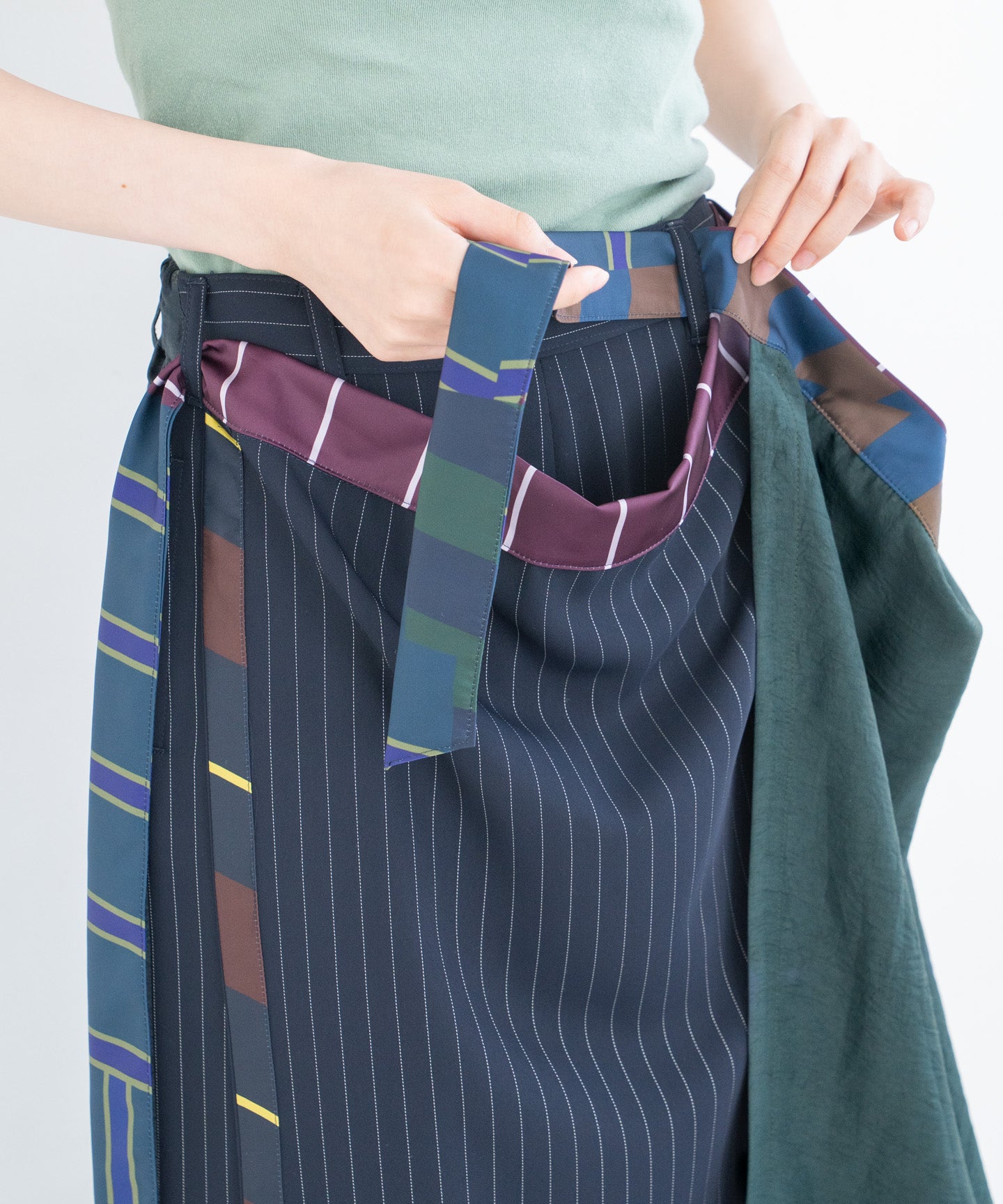 These pants can be worn both front and back, and come in two different colors. They combine wrinkle-resistant recycled polyester with acetate, which has a vintage-inspired wrinkled finish and a glossy sheen. They have a smooth texture and a beautiful drape, and the silhouette sways with every step, like a billowing sail. The accent fabric on the sides can be worn around the waist to create a skirt-like look, or left down to enjoy the flowing silhouette. These versatile pants can be styled however you like.