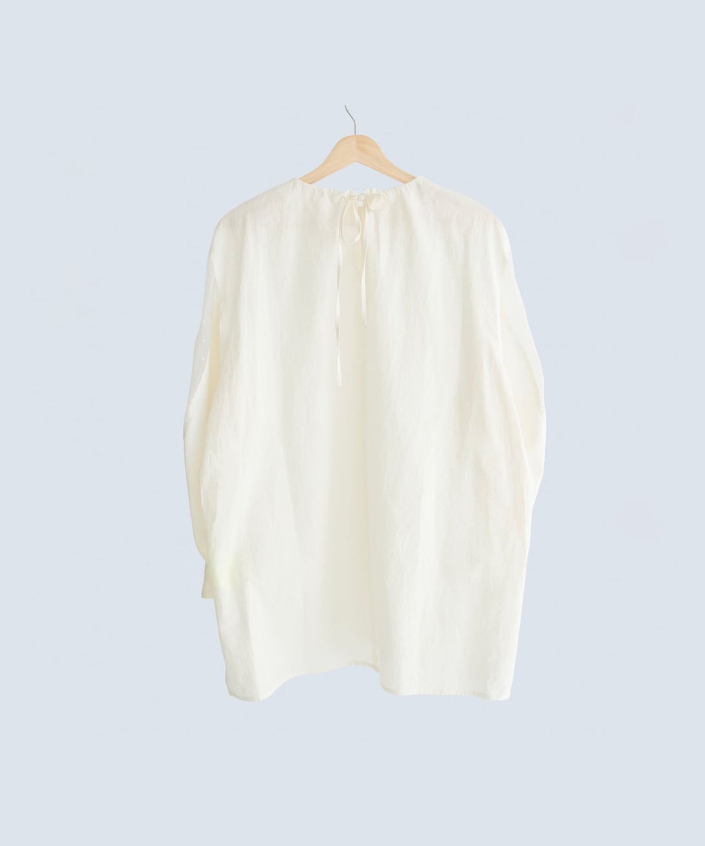 The base is made from a natural cotton hemp material, while the sheer sleeves are made from a pompom jacquard made in Kiryu. The combination of different white textiles creates a basic yet distinctive look. It can be worn tucked in or out with your bottoms. The shirt has COQ's classic pintuck sleeves and ribbon at the back.