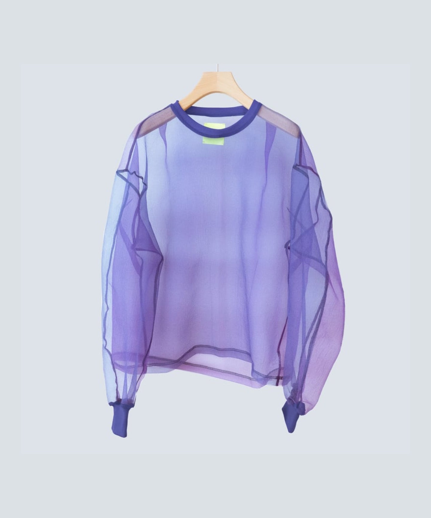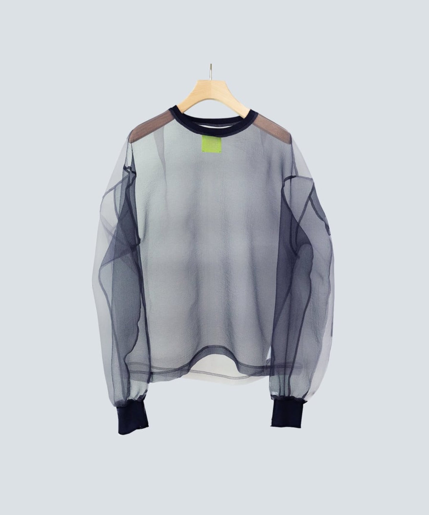 This sheer pullover combines soft, wrinkled organza with a subdued sheen in a two-tone color scheme. All of the fabric is sheer, highlighting COQ's signature two-tone design. The sleeves and back feature a three-dimensional pattern, creating a classic pullover silhouette in the front and a fluffy, balloon-like silhouette in the back. The cuffs and collar are made of ribbed material for a casual look and easy on and off. Made from polyester and cotton, it is machine washable.