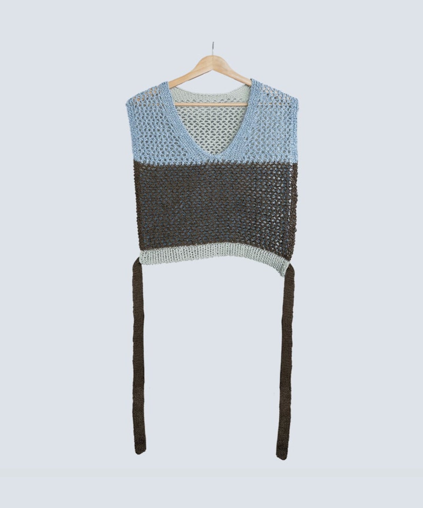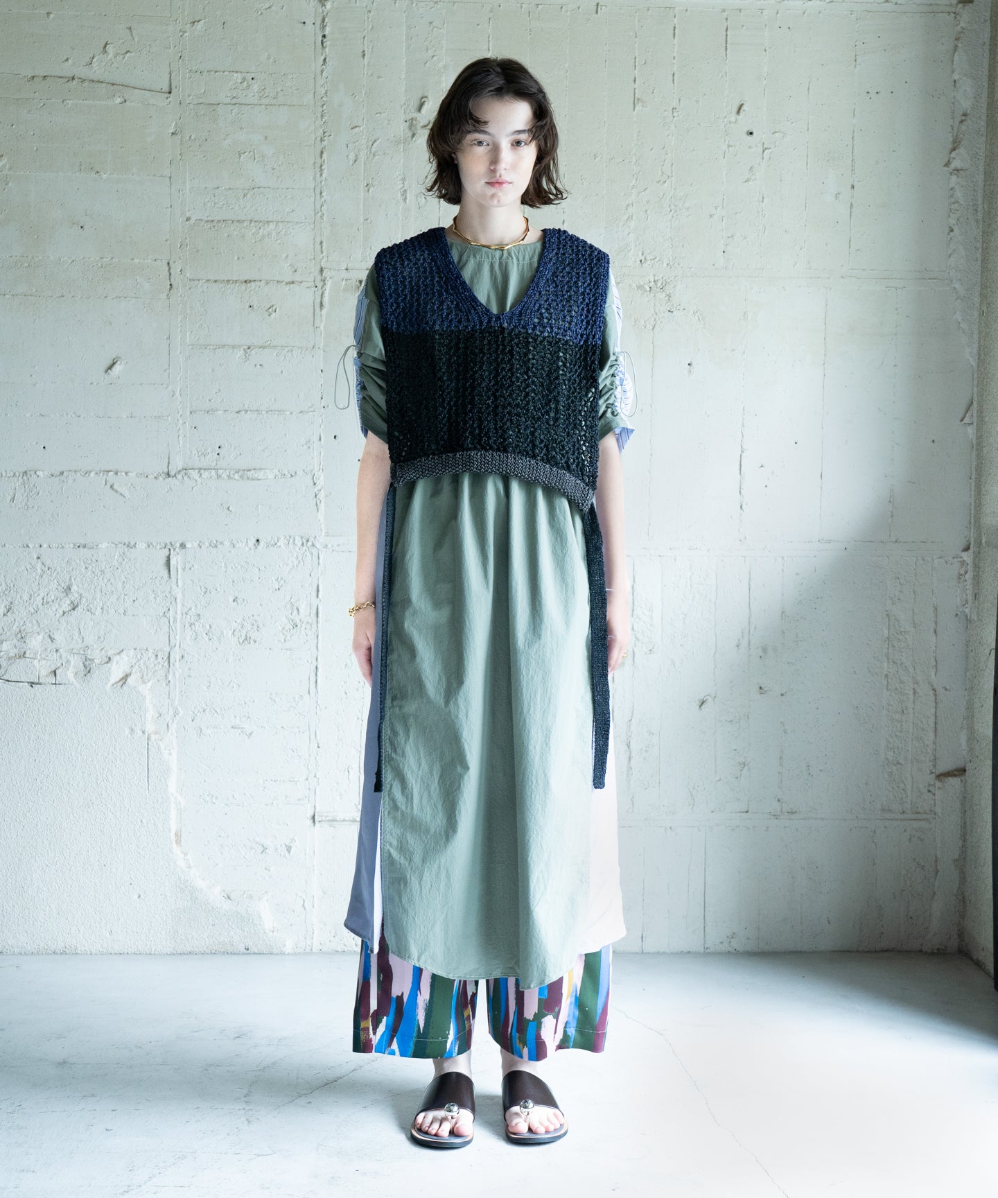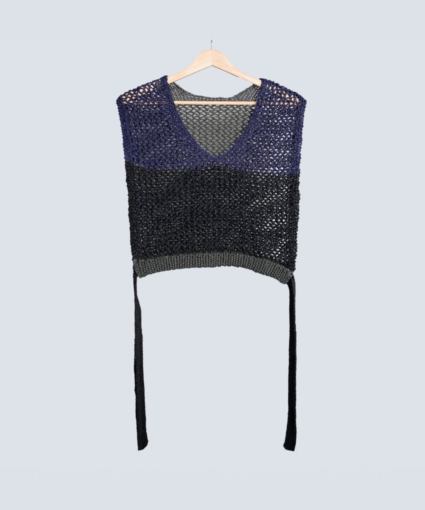 This vest is knitted loosely using 100% washi paper yarn. It features the dry feel and lightness that only washi paper can provide. The bold color blocks characteristic of COQ are finished in a macrame style for a craft-like design. Enjoy layering it with items underneath.