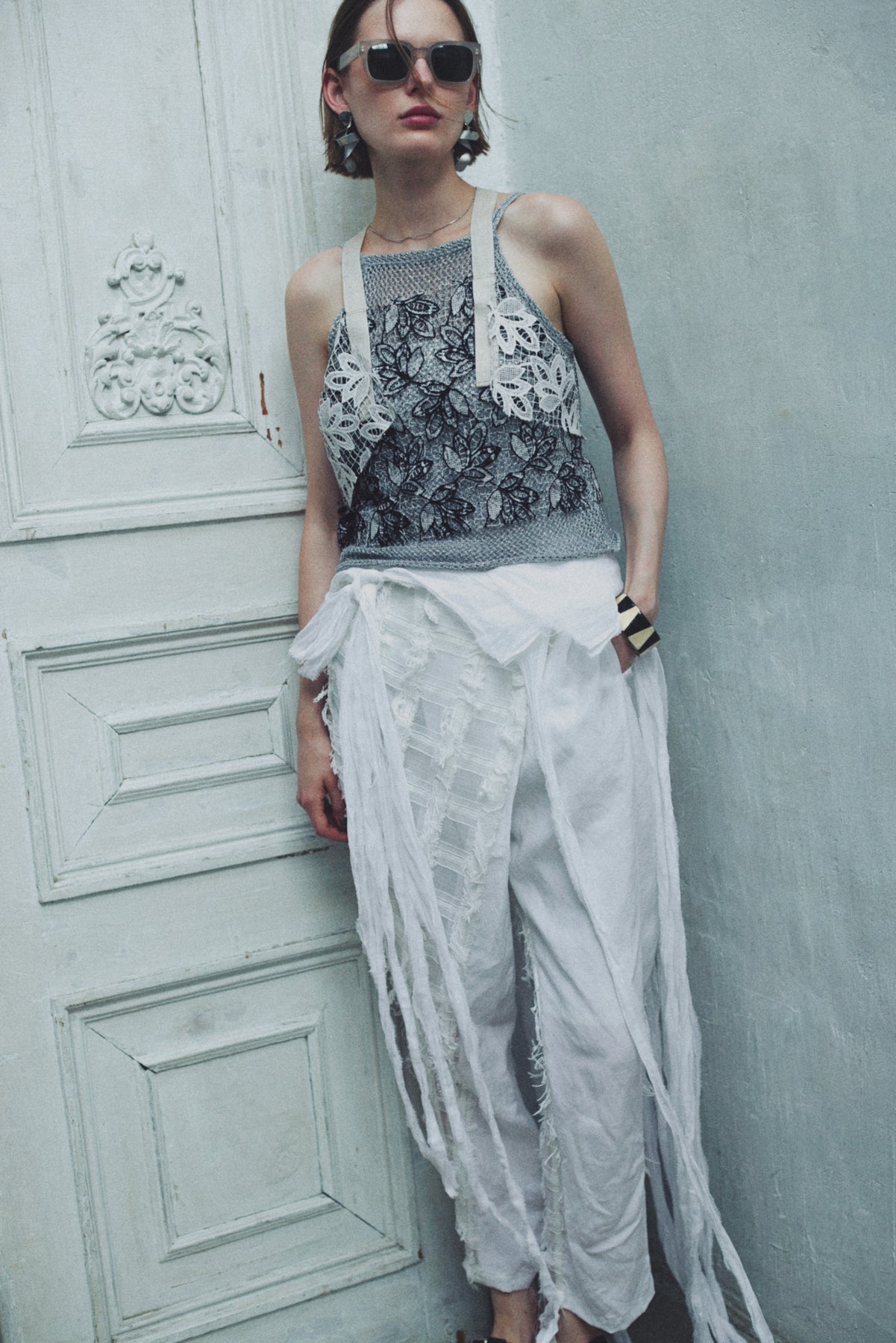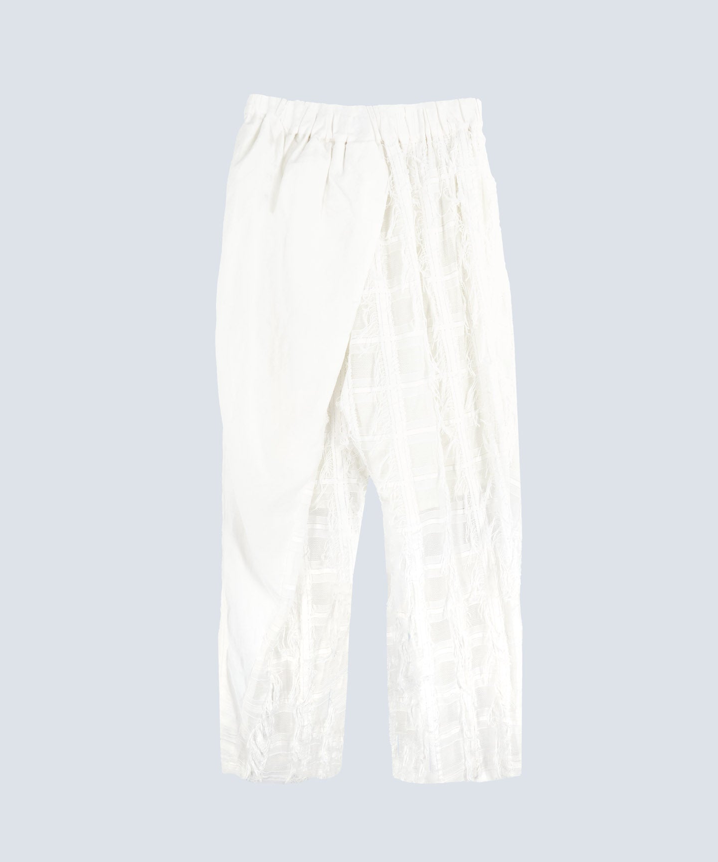 レースは草原のようにフサフサとフリンジが揺れる立体的な表情が特徴で、甘くなりがちなレースをアートのようなユニークな素材に仕上げています。