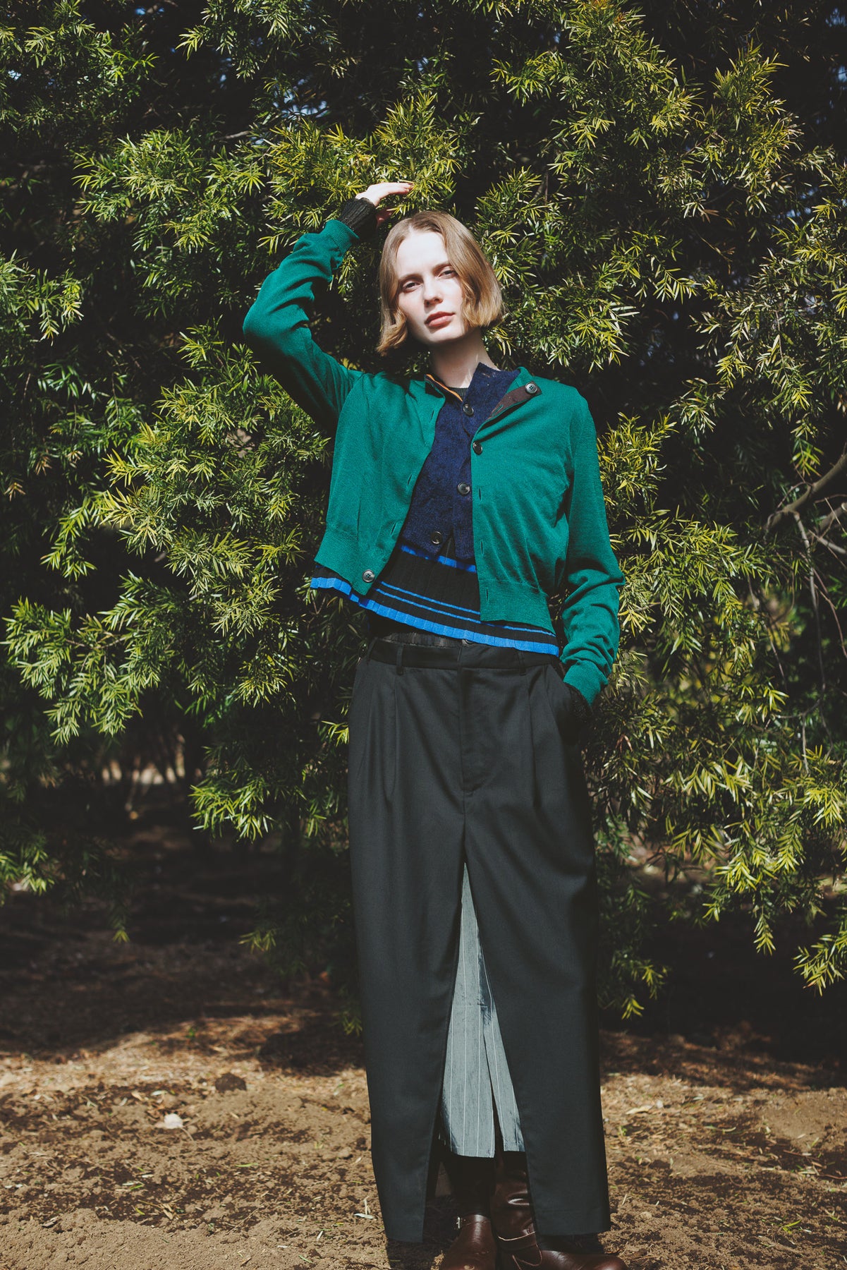 深めに入れたスリットが女性らしい抜け感を生み、スリットから覗くキュプラ裏地がさりげないアクセントになっています。
