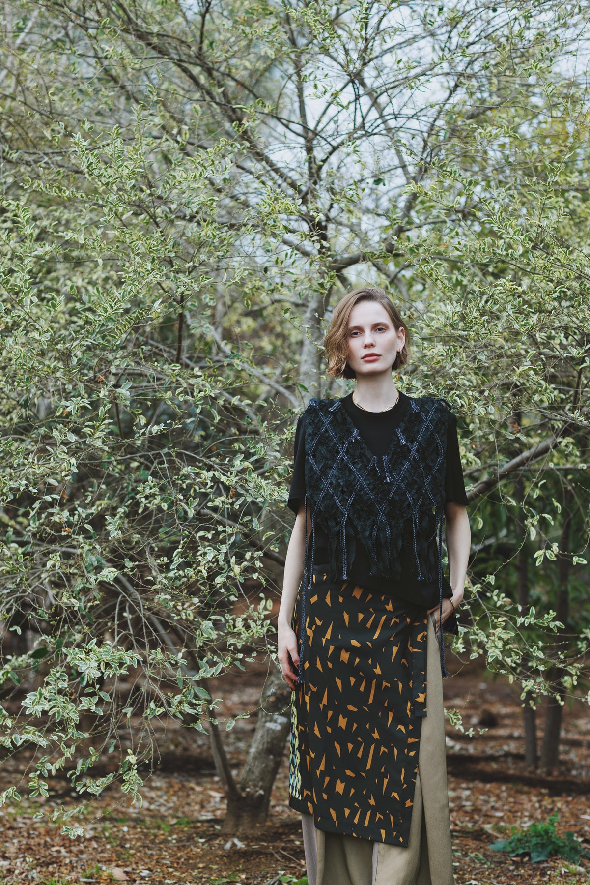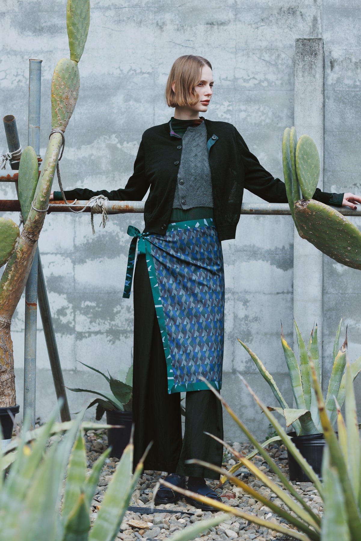 タックパンツと、取り外してアレンジ可能なスカーフを組み合わせたマルチボトム。